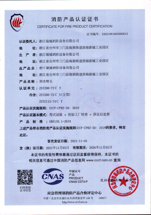 产品标准:GB5135.1 《自动喷水灭火系统 第1部分:洒水喷头》