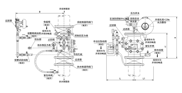 雨淋报警阀和开式洒水喷头组成雨淋系统,通常安装在发生火灾时火势发展迅猛、蔓延迅速的场所;雨淋报警阀还适用于水喷雾系统、水幕系统等。发生火灾时由火灾自动报警系统或传动管控制,自动开启雨淋报警阀组和启动消防水泵,供水灭火。