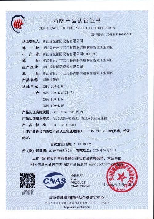 产品标准:GB5135.5《自动喷水灭火系统 第5部分:雨淋报警阀》