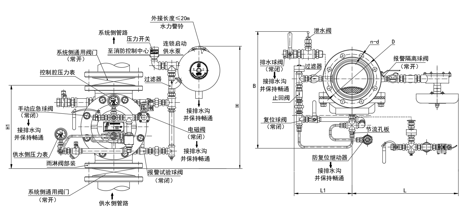 雨淋报警阀和开式洒水喷头组成雨淋系统,通常安装在发生火灾时火势发展迅猛、蔓延迅速的场所;雨淋报警阀还适用于水喷雾系统、水幕系统等。发生火灾时由火灾自动报警系统或传动管控制,自动开启雨淋报警阀组和启动消防水泵,供水灭火。