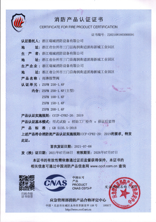 产品标准:GB5135.5《自动喷水灭火系统 第5部分:雨淋报警阀》