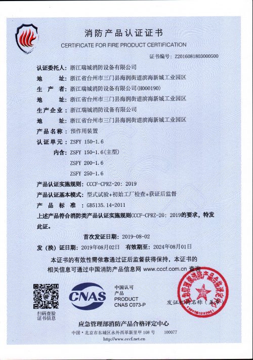 产品标准:GB5135.14《自动喷水灭火系统 第14部分:预作用装置》