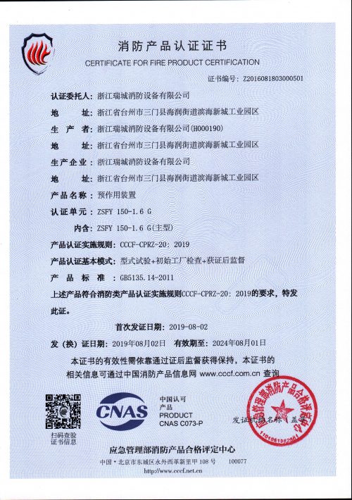 产品标准:GB5135.14《自动喷水灭火系统 第14部分:预作用装置》