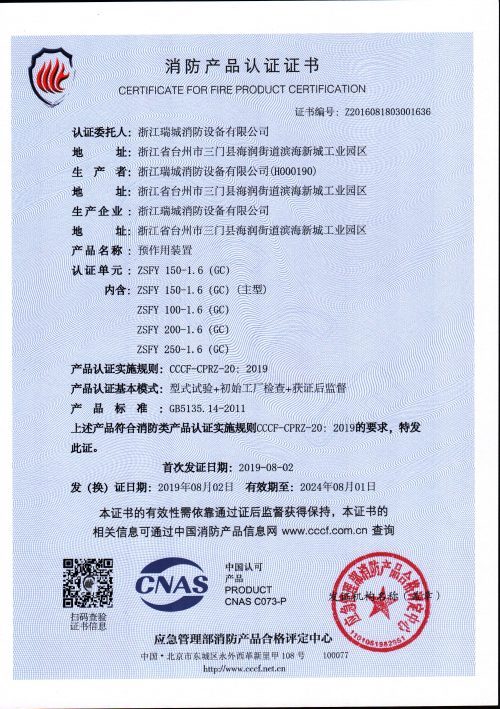 产品标准:GB5135.14《自动喷水灭火系统 第14部分:预作用装置》